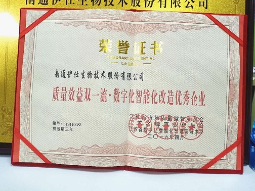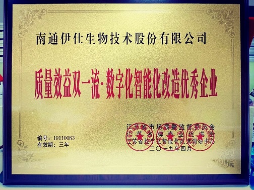 經江蘇省市場質量監(jiān)督委員會、江蘇省數字化智能化改造調研中心、江蘇名牌事業(yè)促進會綜合調查審核評議,南通伊仕生物技術股份有限公司符合江蘇省質量效益雙一流·創(chuàng)新驅動轉型升級優(yōu)秀企業(yè)的條件,被評為《江蘇省質量效益雙一流·創(chuàng)新驅動轉型升級優(yōu)秀企業(yè)》。
