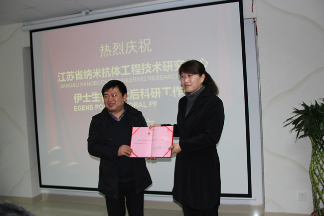 2014年3月20日,南通市伊士生物技術(shù)有限責(zé)任公司在伊士生物研究院會議室舉行了“江蘇省納米抗體工程技術(shù)研究中心、伊士生物博士后研究工作站揭牌儀式”。南通市科技局條件處 劉宏斌副處長,開發(fā)區(qū)經(jīng)貿(mào)局周愛群副局長,科技處程李榮處長,東南大學(xué)生命科學(xué)研究萬亞坤教授,南通大學(xué)吳啟運教授,河南科技學(xué)院李桂榮副教授出席了這次揭牌儀式。