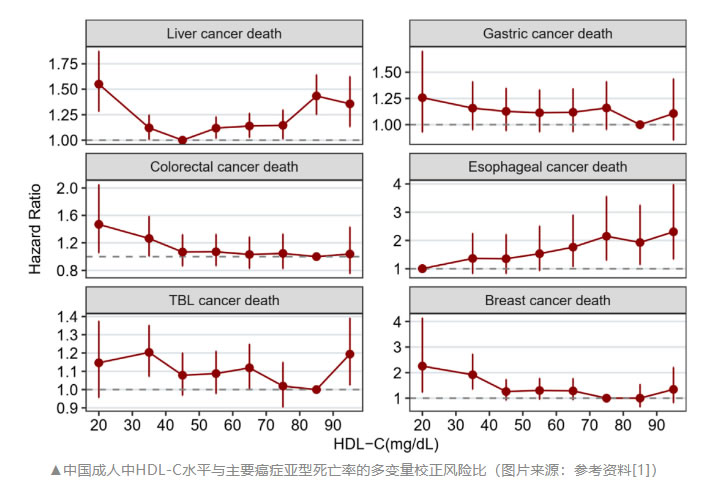 關(guān)于位點(diǎn)特異性癌癥,研究者僅在HDL-C和肝癌死亡率之間發(fā)現(xiàn)了U形關(guān)聯(lián)。與參考水平40 mg/dL~49 mg/dL相比,HDL-C<30 mg/dL(HR 1.55,95% CI:1.28~1.87)和>80 mg/dL(HR高于1.35,95% CI高于1.10)與肝癌死亡風(fēng)險(xiǎn)較高相關(guān)。此外,HDL-C<40 mg/dL(HR 高于 1.90,95% CI 高于 1.20)受試者的乳腺癌死亡率顯著更高,而HDL-C>70 mg/dL的受試者的食管癌死亡率顯著更高(HR高于1.90,95% CI高于1.10)。